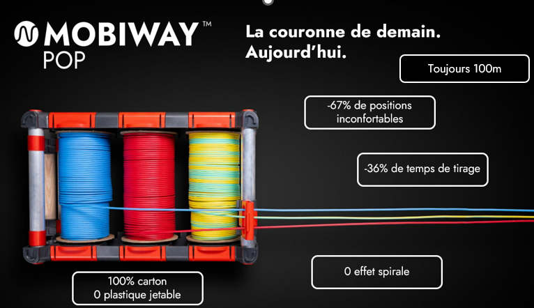 The Nexans Mobiway Pop tool has been designed to facilitate the work of installers. The compact spool format drastically reduces the spiral effect and facilitates wire pulling. This Nexans innovation is unique and saves time and comfort on worksites.