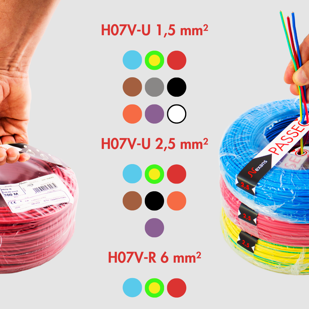 Nexans H07V-R are insulated stranded copper conductors, used for fixed protected installations indoors for power supply or lightings (from offices, domestic or commercial buidings...) with voltage up to 1000V AC or 750V DC.